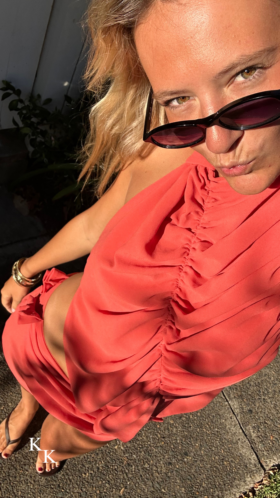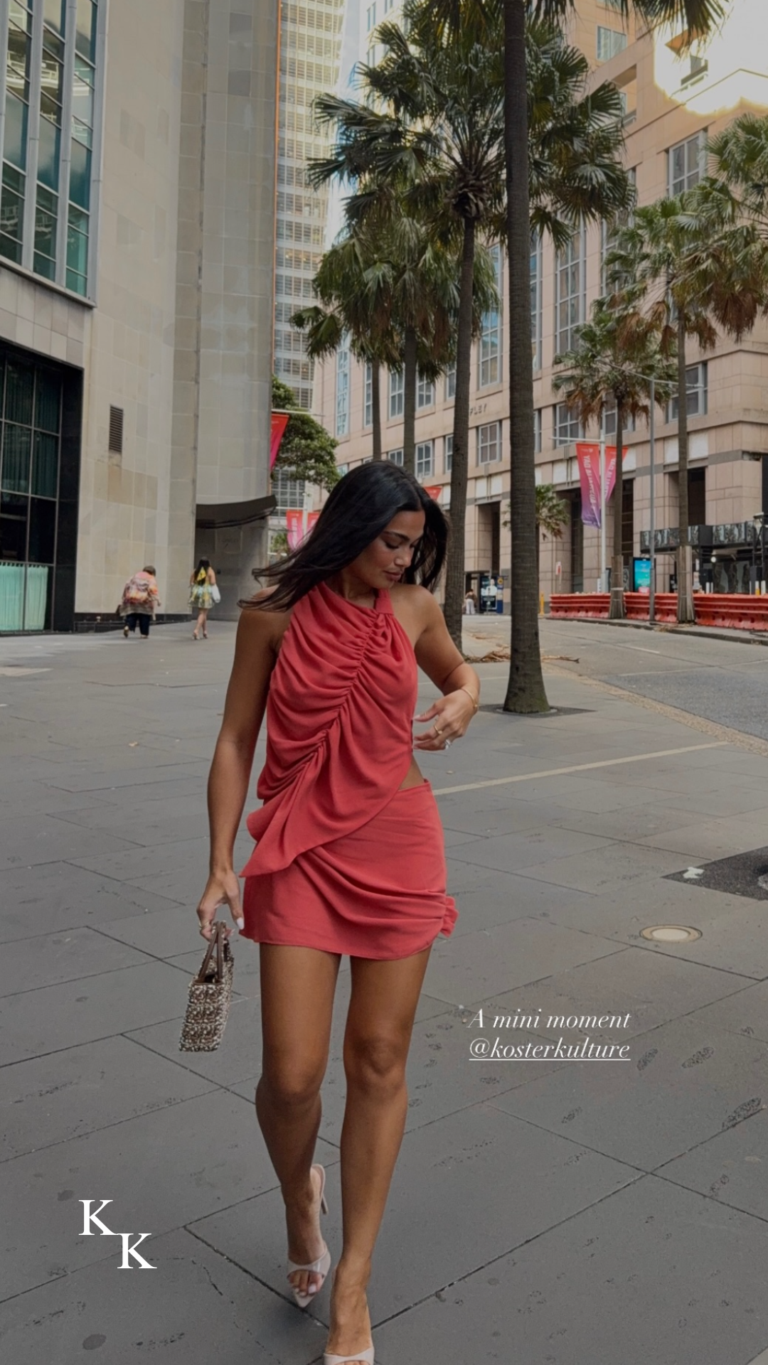 The Bobbies Mini Skirt in Coral by Koster Kulture is a delicate expression of movement and form. Crafted in a vibrant coral orange hue, the design features gentle draping that wraps fluidly across the body. Flared pleating details meet at the waistline and hem to add subtle texture and visual interest, while the asymmetric overlay enhances the skirt’s layered depth. Finished with a invisible side zip. Designed to skim the figure with ease, Bobbies Mini balances romantic softness with modern structure — pair with the matching Bobbies Coral Top for day to night moments.