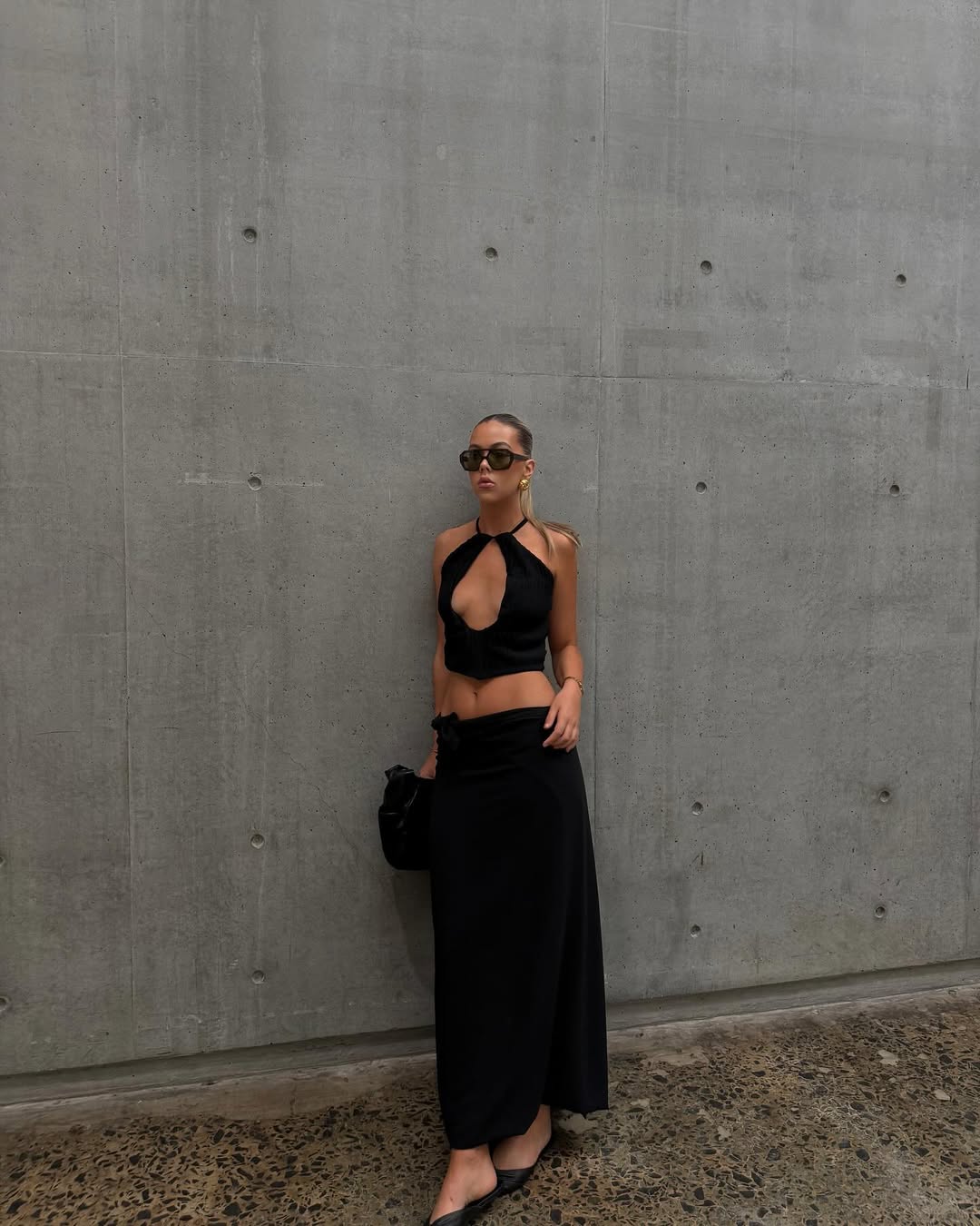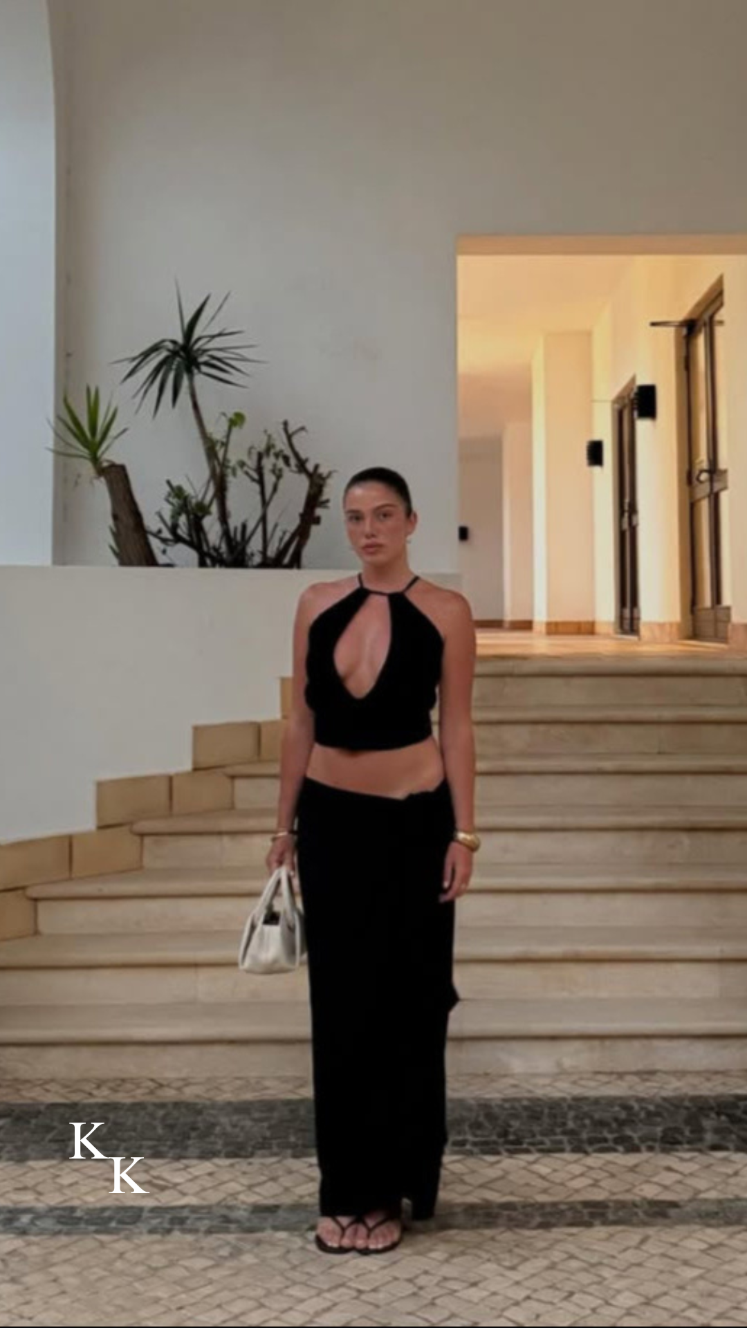Introducing the Bobbies Wrap Skirt by Koster Kulture, crafted from double-lined chiffon in a rich midnight black hue. Designed to feel flirtatious yet refined, this flowing silhouette moves effortlessly with every step, elevated by an elegant side slit. The wrap design cinches at the waist followed by an elongated, floor-sweeping hemline.
