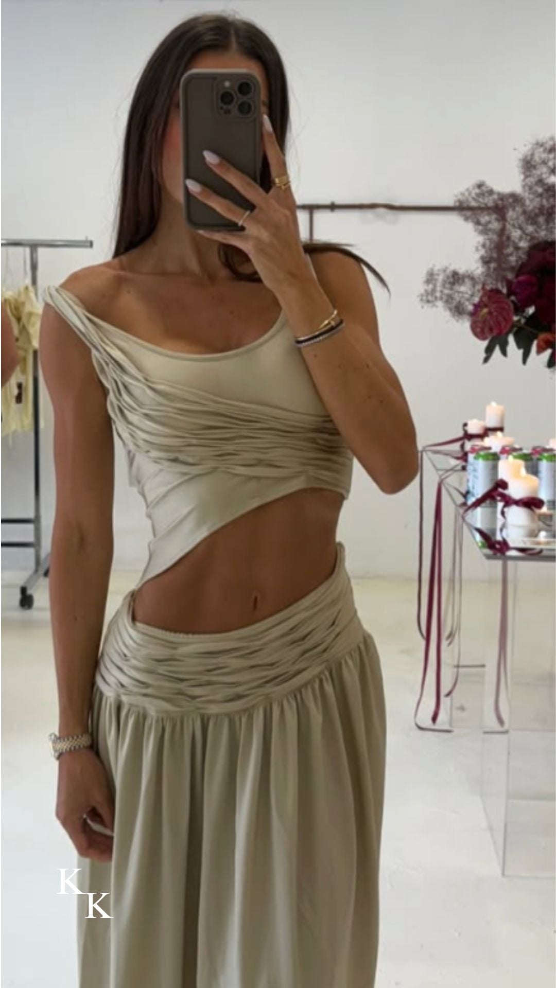 The Calypso Skirt by Koster Kulture embodies classic artistry with sculptural draping and a goddess-like silhouette. Cut from glossy soft gold stretch, with a subtle liquid sheen, Calypso is designed with a diagonally scooped waistline to elongate the feminine form and finished with a thick abstract pleated waistband. The silhouette falls effortlessly into a fluid, full-length hem, creating a refined yet sensual finish. A statement piece that is designed to be dressed up or down.