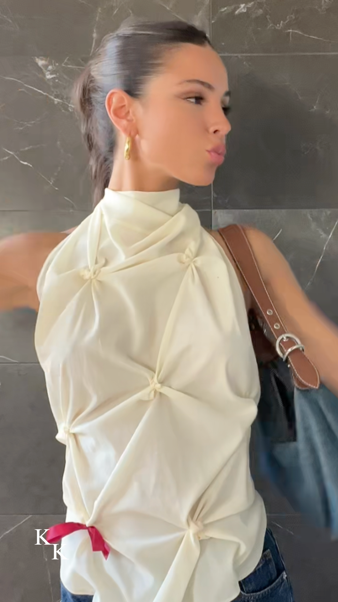 Introducing the Marbella Halter Top in Ivory by Koster Kulture—an effortlessly romantic off white halter top with delicate hand-crafted gathering details that softly contour the body. The buttery soft ivory hue is accented with an optional deep wine-colored bow, blending elegance with contrast. Designed with an adjustable tie at the neck and one at the waist, Marbella offers styling versatility: wear as a halter or one-shoulder top with an open low back. Style with the Ivory Marbella Skirt for a matching skirt and top ensemble.