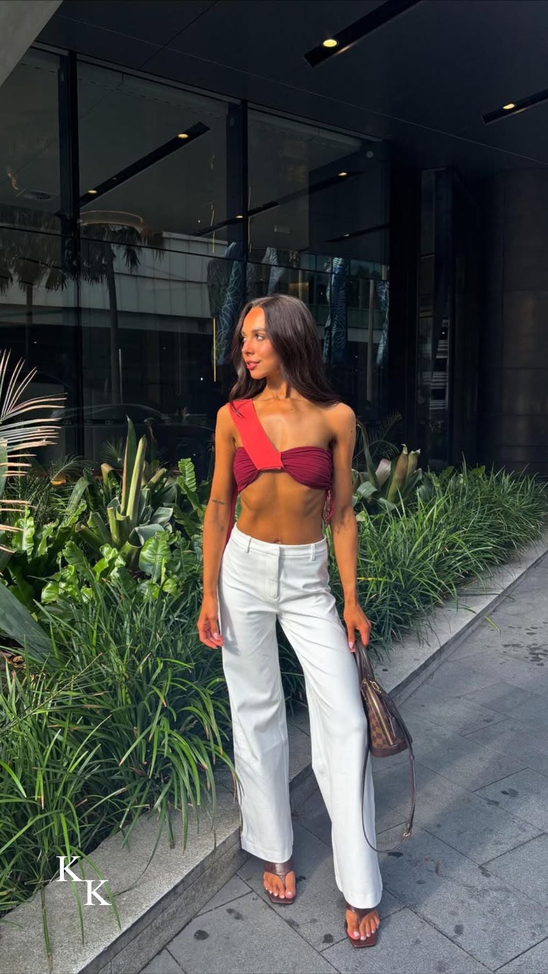 The Ora Top by Koster Kulture sculpts and structures the feminine form. Featuring finely pressed hand crafted pin-tuck pleats in a deep red wine bandeau bust, complimented by gathered front detailing from a contrasted coral pleated sash that drapes over the shoulder fluidly. Finished with dainty lace up side ties that cross together to secure an adjustable fit. Ora is a statement piece designed for elevated resort wear and balmy evenings.